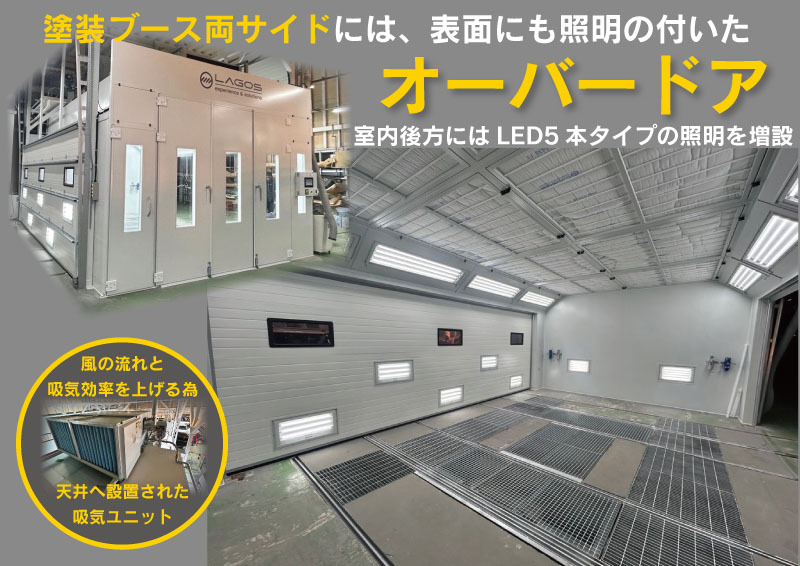 - 両サイドは、表面にも照明の付いたオーバードア。 中も外も明るく、室内後方に、LED5本タイプの照明を増設し作業環境が整いました。