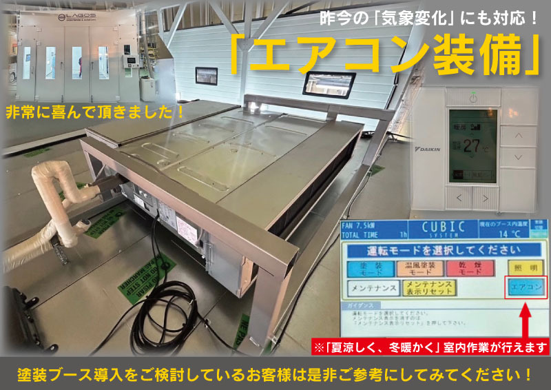 - 昨今の「気象の変化」で夏が異常に暑いので、エアコンを装備しております。「夏涼しく、冬暖かく」室内作業が行えます。