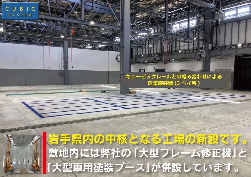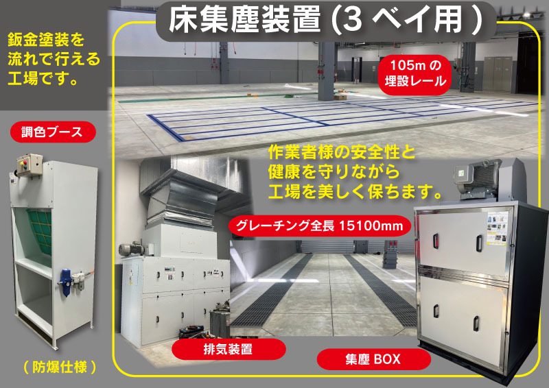 大型車用塗装ブース、キュービックレール、 床集塵装置(3ベイ用)、色調ブースを新工場へと設置いたしました。