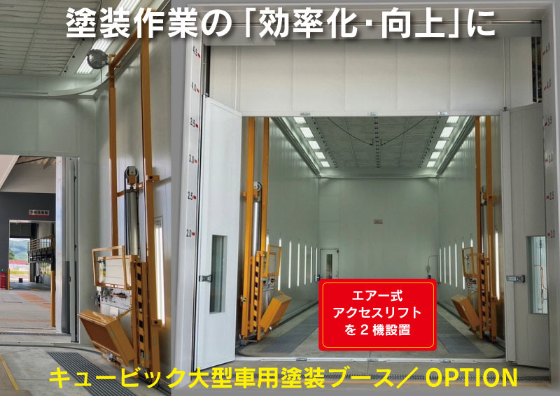• 大型塗装ブース内にはオプションでエアー式・アクセスリフトを2機設置させて頂きました。塗装作業の効率化、向上に繋がります。