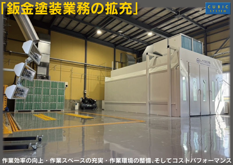 鈑金塗装業務の拡充で、敷地内に工場を設置され、弊社キュービックシステム(鈑金・塗装)の御依頼を頂き、作業効率の向上・作業スペースの充実・作業環境の整備、そしてコストパフォーマンス。