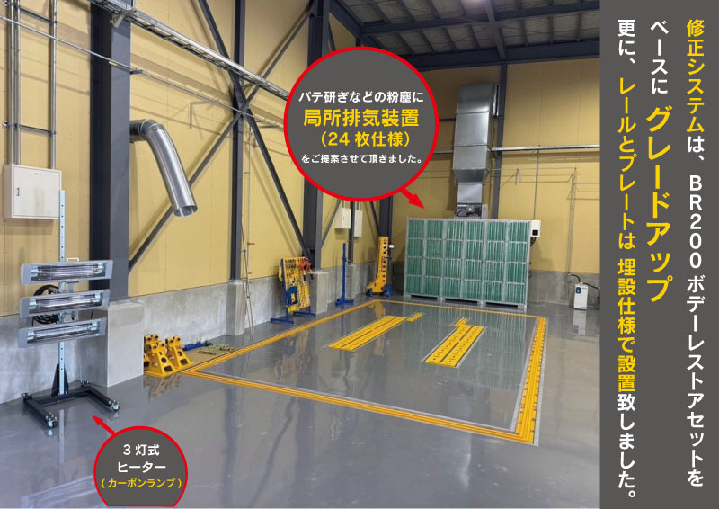 - 修正システムは、BR -200ボデーレストアセットをベースにグレードアップ。 更に、レール及びプレートは埋設仕様で設置致しました。