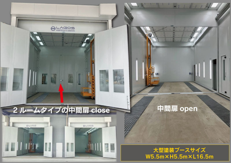 - 大型塗装ブース (2ルームタイプ)W5.5m×H5.5m×L16.5m 3Dアクセスリフト 2機
