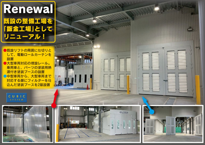 - 中型車両から、大型車両まで対応する扉にフィルターを仕込んだ大型塗装ブースを2基設置。