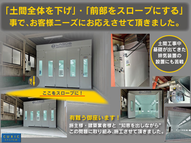 - ブース設置の土間全体を下げ、前部をスロープにする事で、お客様ニーズにお応えさせて頂きました。