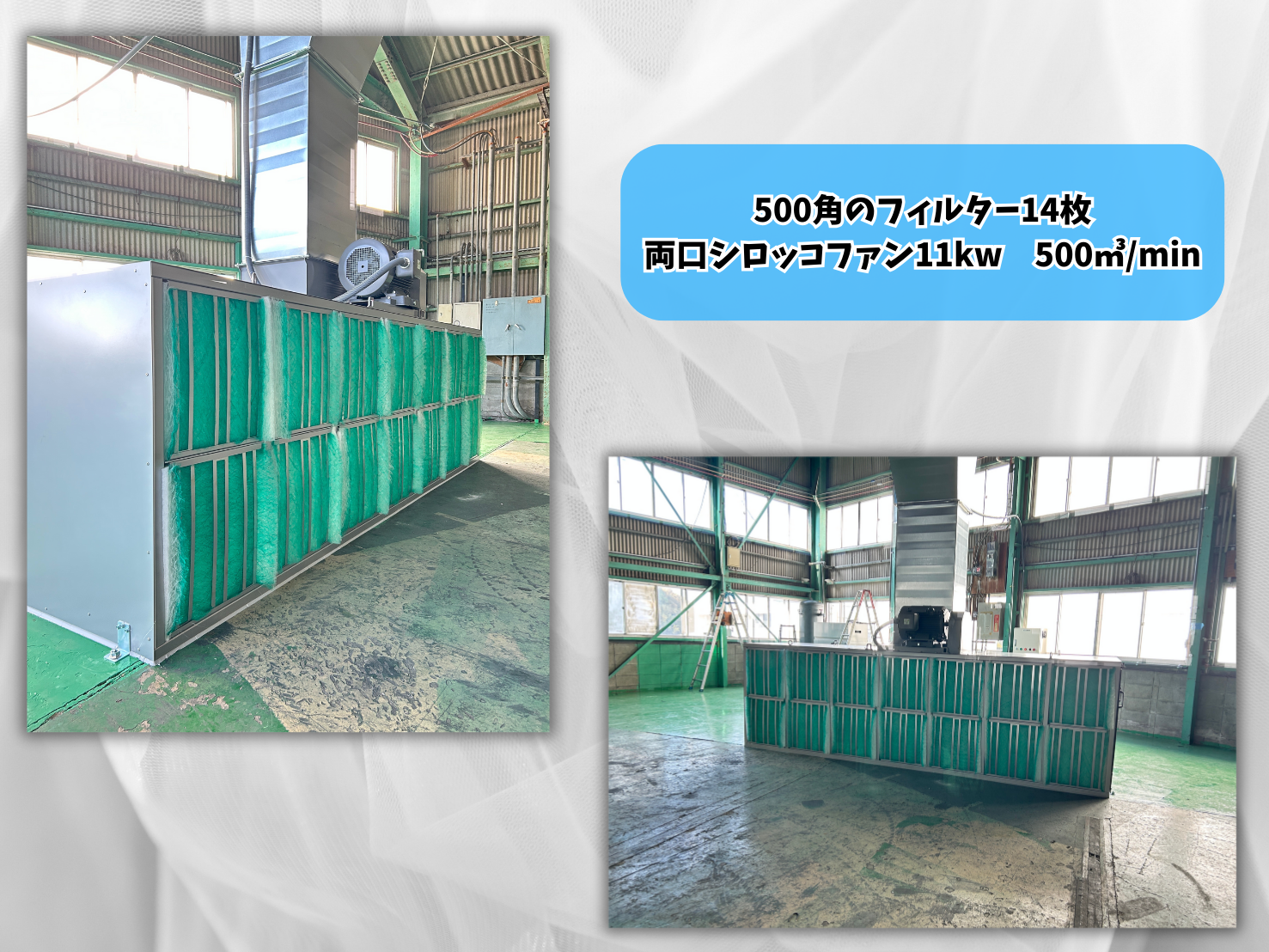 500角のフィルター14枚、両口シロッコファン11kw 500㎥/minの能力です。