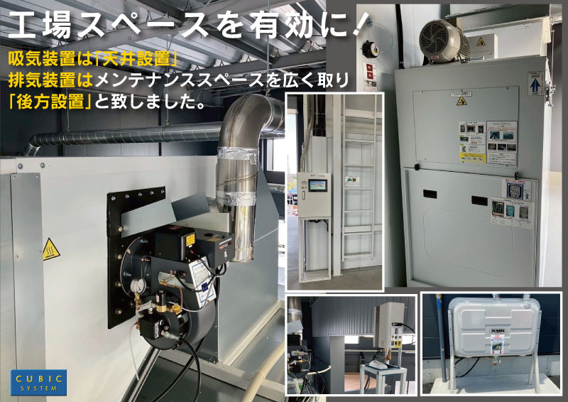 - 「スペースを有効に使用したい」と、ご希望頂き吸気装置は「天井設置」・排気装置はメンテナンススペースを広く取り「後方設置」と致しました。