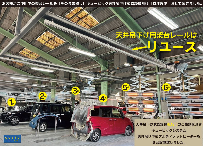 - キュービック天井吊下げ式乾燥機は既存の滑車を再使用し取付ける事が可能です。 6台であれば施工時間は1日で完了します。