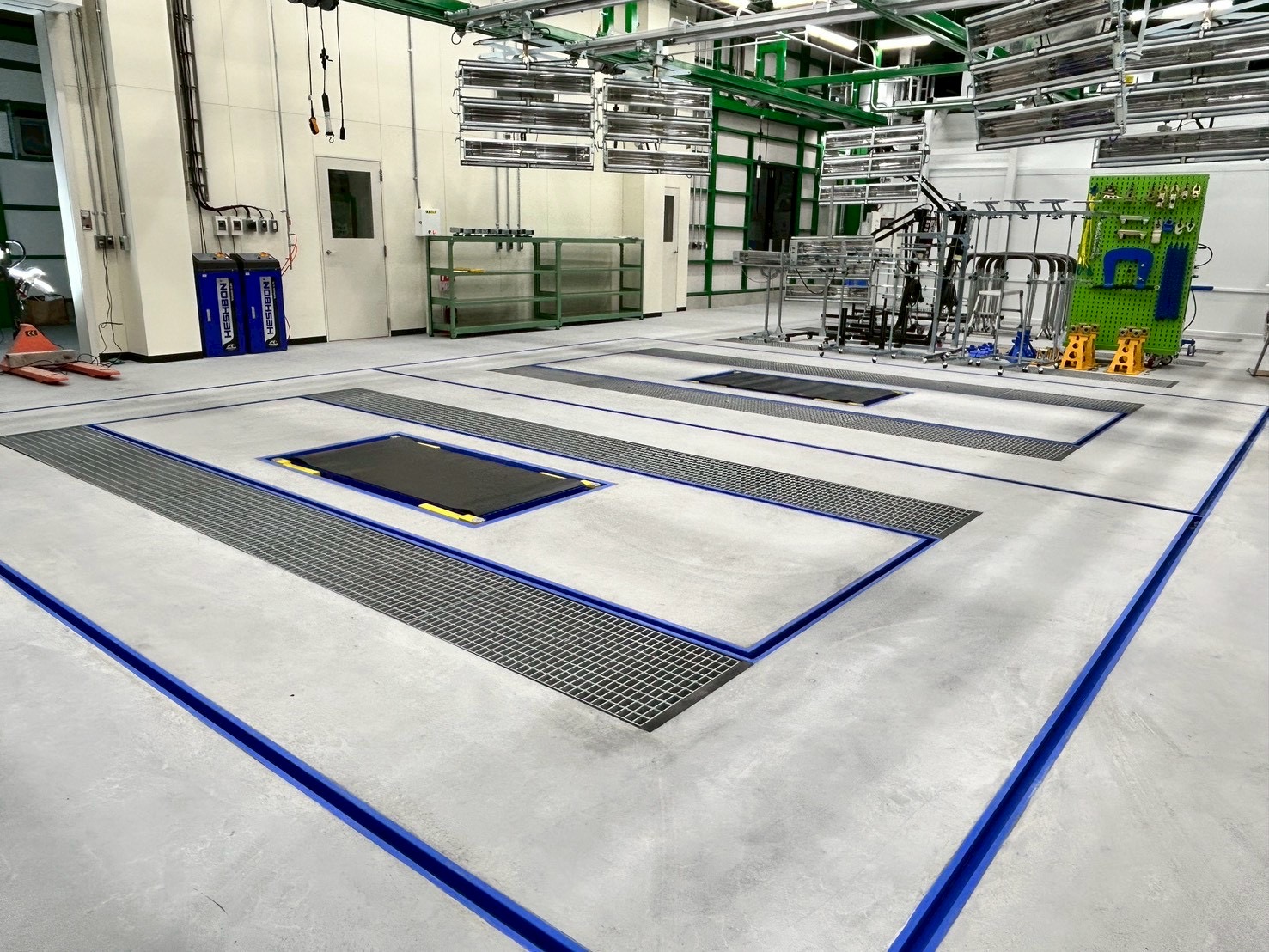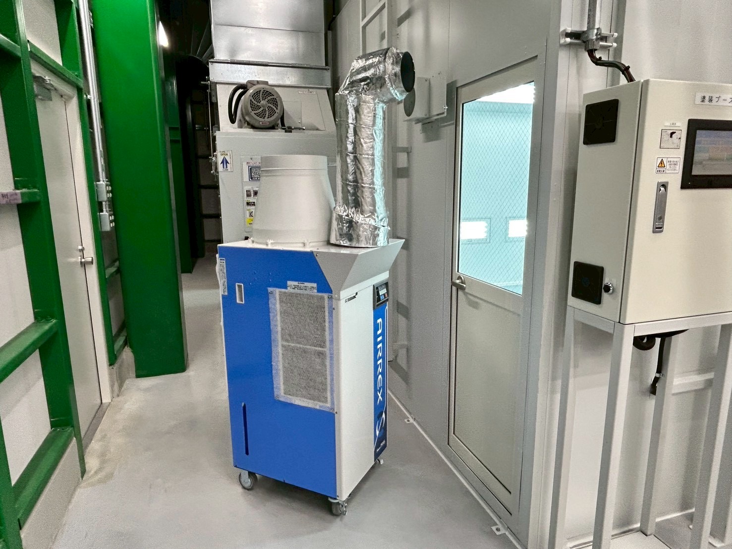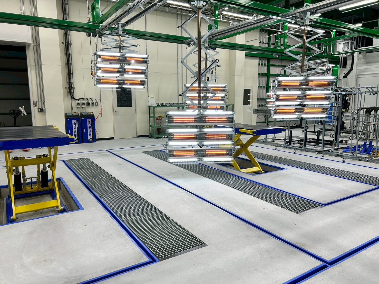 修正装置、床集塵装置、LED照明付き温度調整機能付き吊り下げヒーター、吸気装置天井設置スポットクーラー装備の塗装ブースを2連、検車装置など工場全体でご提案・設置致しました。