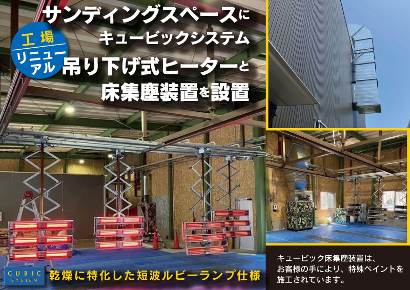 工場リニューアルに伴い、サンディングスペースに、キュービック床集塵装置と、キュービック吊り下げ式ヒーターを設置させて頂きました。