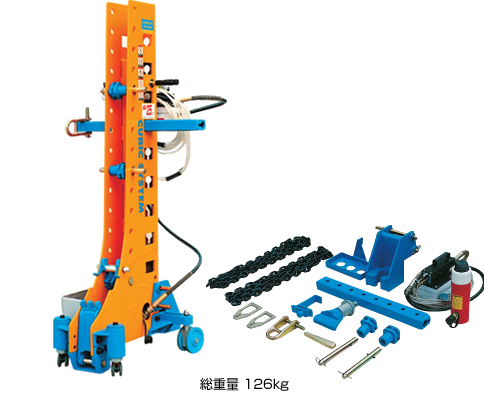 タワーを動かすことなくタワーを中心に左右140°動き高さ調整もできるので安全にアッパー方向への引きが可能です。また、エンジンの脱着も可能です。(耐荷重1トン)